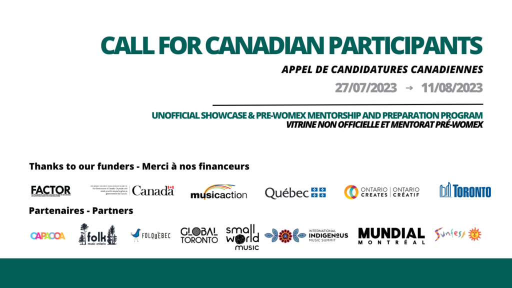This year, CAPACOA, Folk Music Ontario, Folquébec, Global Toronto, Small World Music, International Indigenous Music Summit, Mundial Montréal and Sunfest are joining forces to organize a call for artists for professionals participating in WOMEX 2023 and wishing to develop their international careers.