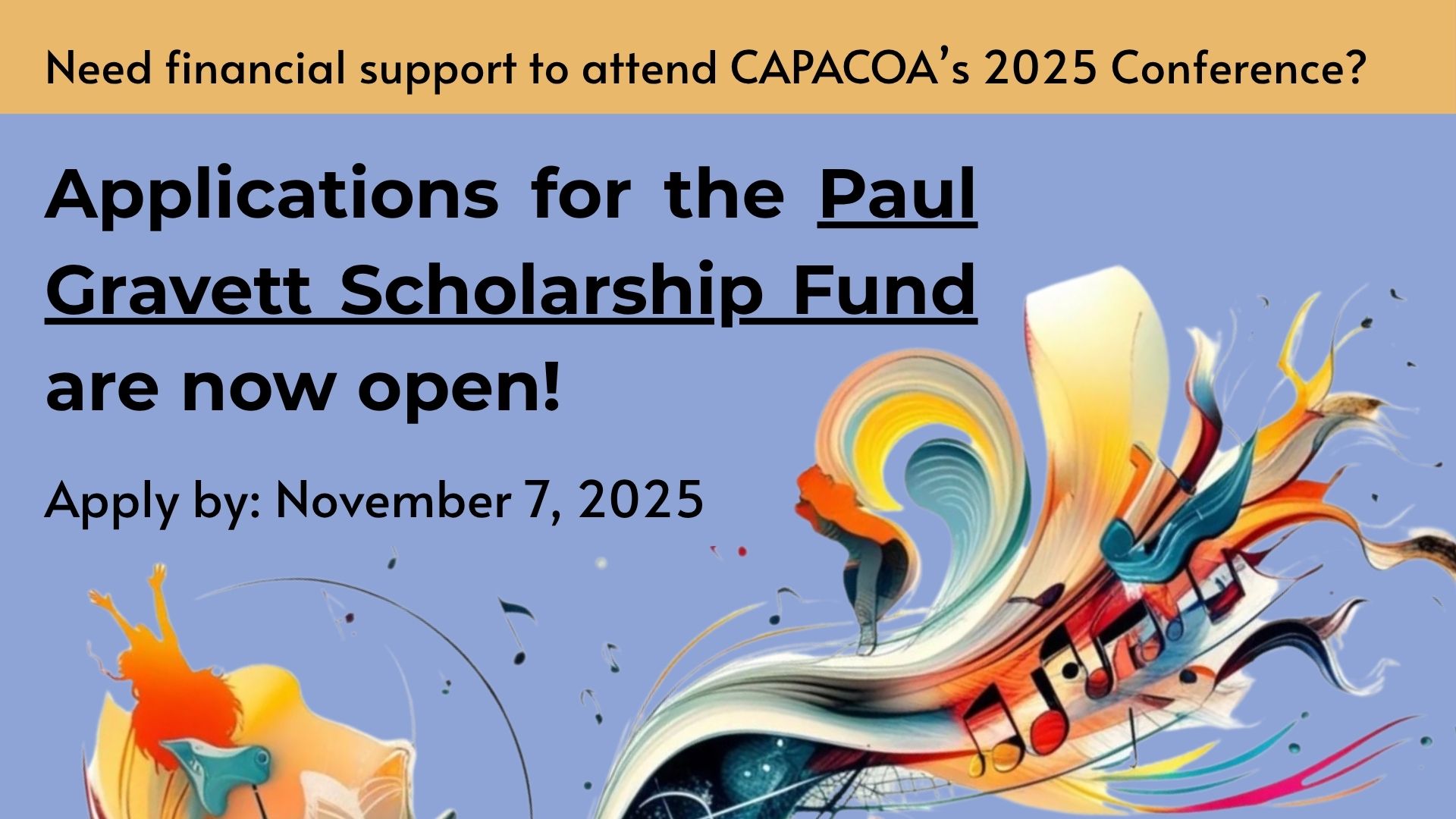 Through the Paul Gravett Scholarship Fund, CAPACOA is able to support guaranteed attendance to the 2025 CAPACOA Conference. This scholarship supports both those facing systemic barriers and emerging young performing arts professionals, for whom the costs of attendance may be prohibitive.