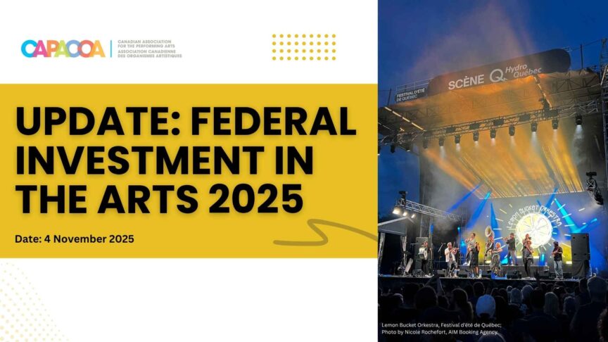 For several years, CAPACOA and its partner associations have asked the government for predictable funding for the domestic touring and presenting market (see our most recent prebudgetary submission). The 2025 budget extends supplementary funding for the Canadian Arts Presenting Fund (CAPF) and Building Communities through Arts and Heritage (BCAH), this time over three years.