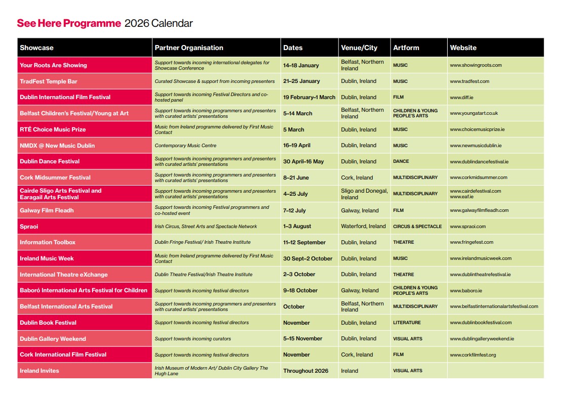 The program will fund Canadian festivals, events, and venues in programming Irish arts of all disciplines (film, literature, dance, theatre, music, etc.) in 2027 as part of existing programs and seasons.