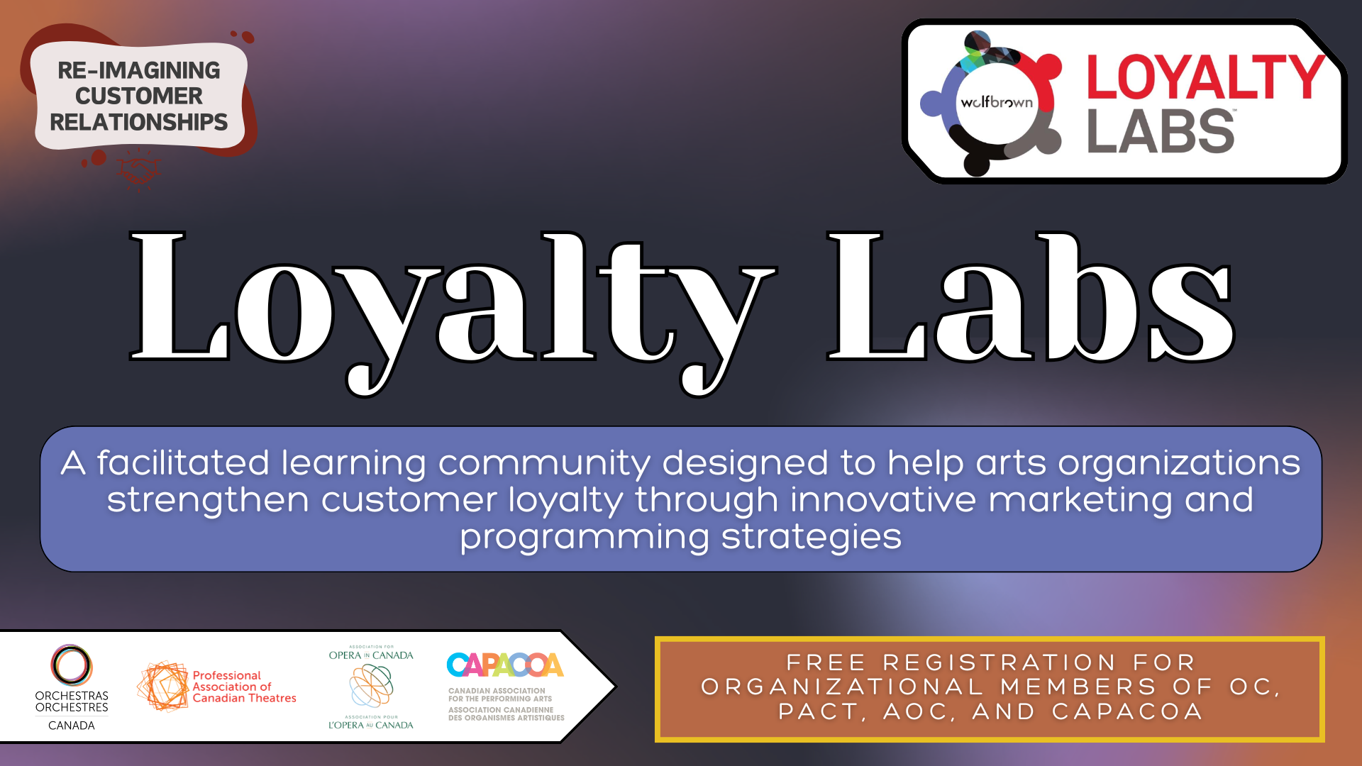 As part of the Re-imagining Customer Relationships project, CAPACOA, Orchestras Canada (OC), the Professional Association of Canadian Theatres (PACT), and the Association for Opera in Canada (AOC) are pleased to partner with WolfBrown, a U.S.-based research and consulting firm, to offer free participation in the new Loyalty Labs program to all organizational members of these arts service organizations.