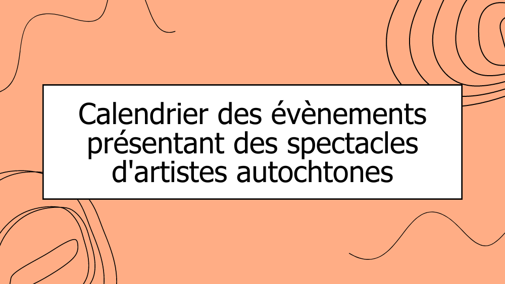 Si vous représentez une organisation des arts de la scène intéressée à faire figurer vos évènements dans ce calendrier, vous pouvez contacter le bibliothécaire autochtone de CAPACOA à l’adresse suivante : [email protected].