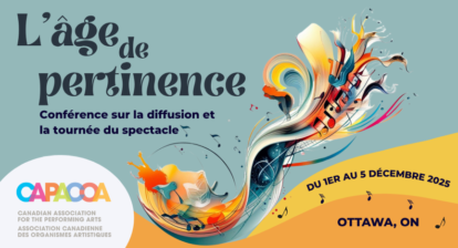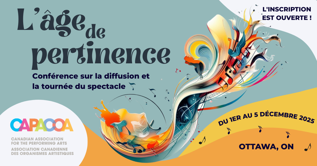 Joignez-vous à CAPACOA du 1er au 5 décembre 2025 à Ottawa pour vivre L’âge de pertinence : une conférence audacieuse et pluridisciplinaire qui rassemble les acteurs nationaux et internationaux de la diffusion et de la tournée au Canada. Participez à la conférence la plus marquante de CAPACOA à ce jour, alors que nous explorerons le rôle en constante évolution des arts de la scène dans la société et la façon d’y œuvrer efficacement.