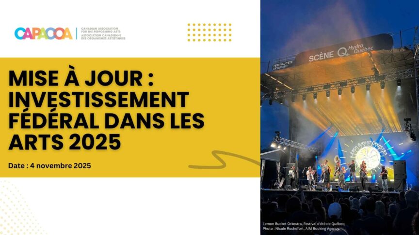CAPACOA et ses associations partenaires demandent depuis plusieurs années au gouvernement un financement prévisible pour le marché domestique de la tournée et de la diffusion (voir la plus récente soumission prébudgétaire). Le budget 2025 renouvelle les fonds supplémentaires au Fonds du Canada pour la présentation des arts (FCPA) et à Développement des communautés par le biais des arts et du patrimoine (DCAP), cette fois-ci pour une échéance de trois ans.