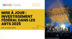 Des fonds supplémentaires pour les diffuseurs et festivals ont été prolongés dans le budget fédéral 2025. Le budget fédéral 2025 investira 769 millions de dollars sur cinq ans dans des programmes, agences et initiatives relevant des arts et la culture, dès 2025-2026. De ce montant, 67,5 millio...Lire la suite