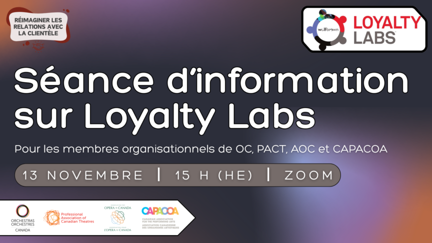 Dans le cadre du projet Réimaginer les relations avec la clientèle, CAPACOA, Orchestres Canada (OC), la Professional Association of Canadian Theatres (PACT) et l’Association pour l’Opéra au Canada (AOC) sont heureuses de s’associer à WolfBrown afin d’offrir une participation gratuite au nouveau programme Loyalty Labs à tous les membres organisationnels de ces associations de services aux arts.