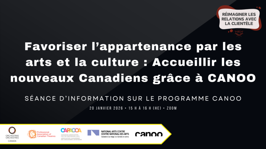 Cet événement est coorganisé par CAPACOA, Orchestres Canada, le PACT, le Centre national des Arts et CANOO. Il est présenté dans le cadre du projet Réimaginer les relations avec la clientèle.