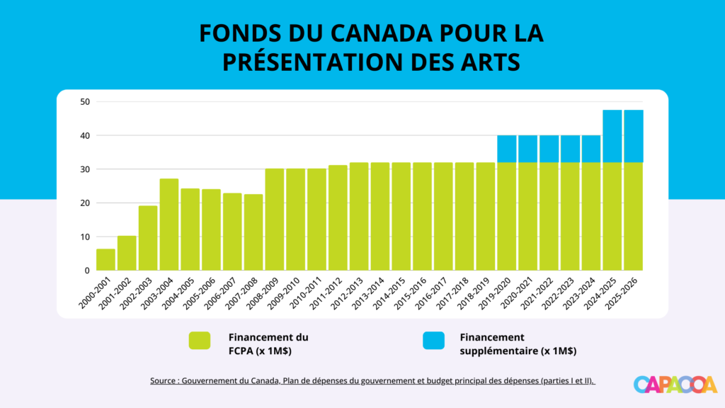 - Le financement supplémentaire du Fonds du Canada pour la présentation des arts (FCPA) et d’autres programmes de Patrimoine canadien doit prendre fin en 2026, ce qui signifie que ces programmes reviendront à leur niveau de financement de 2019. Cela entraînera une réduction importante du soutien au secteur de la diffusion et de la tournée.